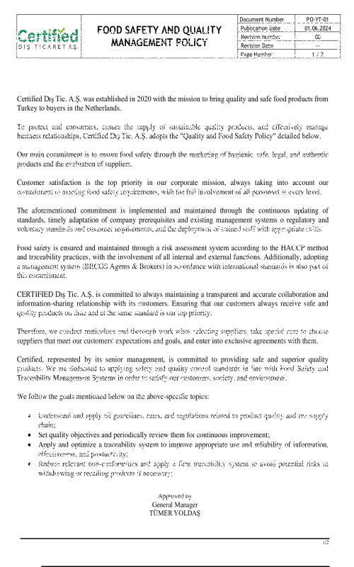 At Certified Dış Ticaret A.Ş., "Food Safety and Quality" are at the top of the list of issues we will never compromise on. The entire process, from the Supplier Selection and Evaluation process to the delivery of the order to our customers' warehouse, is meticulously monitored.